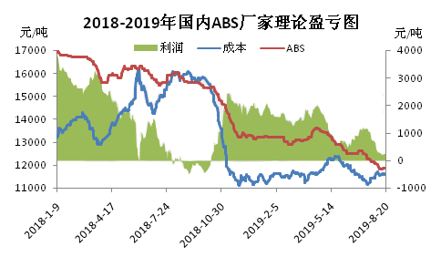 ????????自2019年4月中旬起,國內ABS市場開啟持續(xù)下滑走勢。截至8月20日,華東ABS市場國產(chǎn)料主流報盤在11450-12300元/噸,而國產(chǎn)ABS企業(yè)理論生產(chǎn)成本至11571元/噸。部分低端ABS已跌破理論生產(chǎn)成本線,高端料理論上盈利水平亦縮至低位。成本面支撐下,ABS市場表現(xiàn)出一定的抗跌性。