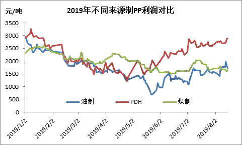 ????????此次東華能源計(jì)劃投產(chǎn)的裝置,繼續(xù)采用PDH工藝,為何近幾年來PDH裝置如雨后春筍般,蜂擁而至?首先從終端產(chǎn)品利潤來看。以聚丙烯為例,2019年丙烷脫氫制聚丙烯平均利潤在2000元/噸以上,下半年以來,因?yàn)楸閮r(jià)格震蕩下行,跌幅遠(yuǎn)大于聚丙烯價(jià)格跌幅,生產(chǎn)企業(yè)利潤好轉(zhuǎn)。丙烷脫氫制聚丙烯利潤明顯好于煤制和油制利潤。