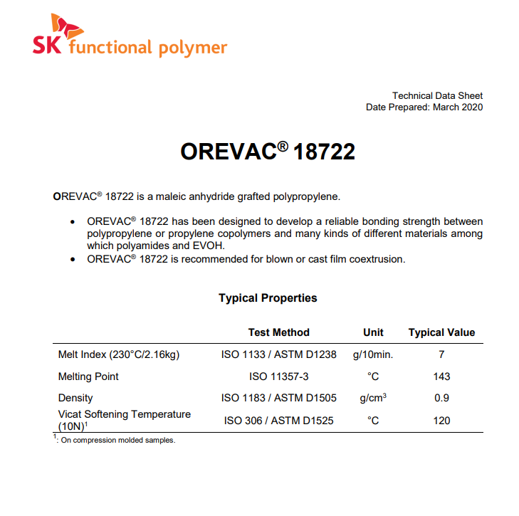 - PP馬來酸酐改性聚丙烯 法國阿科瑪 Orevac 18722 共擠薄膜粘接性 物性表, PP馬來酸酐改性聚丙烯 法國阿科瑪 Orevac 18722 共擠薄膜粘接性 產(chǎn)品參數(shù),PP馬來酸酐改性聚丙烯 法國阿科瑪 Orevac 18722 共擠薄膜粘接性 性能表,PP馬來酸酐改性聚丙烯 法國阿科瑪 Orevac 18722 共擠薄膜粘接性 出廠報告, MSDS,, 物質(zhì)安全資料表, UL黃卡,{ SGS報告, RoHS, 食品級認(rèn)證, NSF飲用水標(biāo)準(zhǔn), 產(chǎn)品資料, 產(chǎn)品性能, 出廠報告, 原廠原包, 代理商, 熱變形溫度, 熔指數(shù), 流動系數(shù), 抗沖擊性能、沖擊強(qiáng)度, 低溫韌性、低溫抗沖擊性能, 熔體流動系數(shù)、熔體流動速率, 加工工藝、加工參數(shù)、加工溫度, 歐盟RoHS 德國FDA 美國FDA 日本FDA