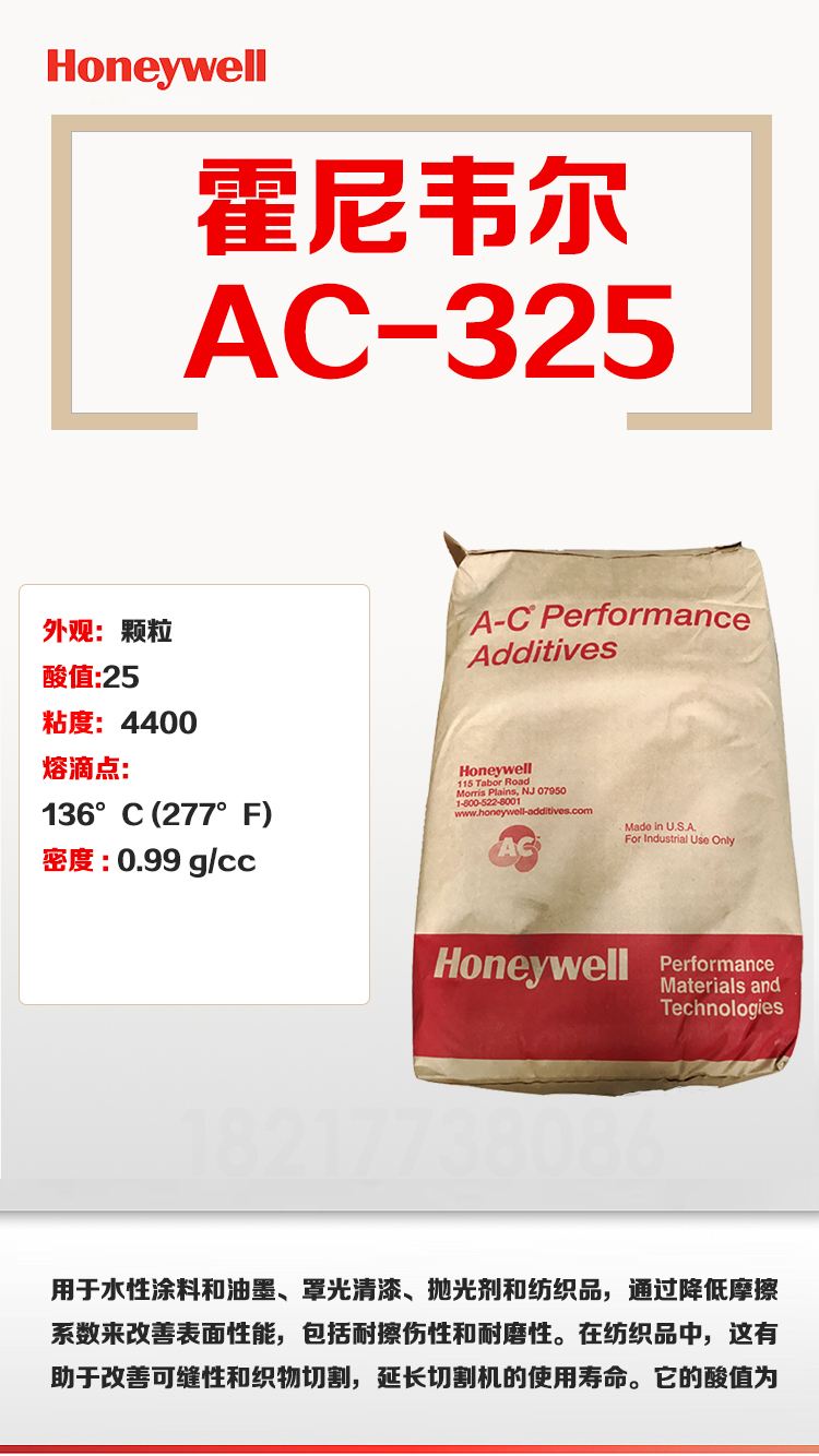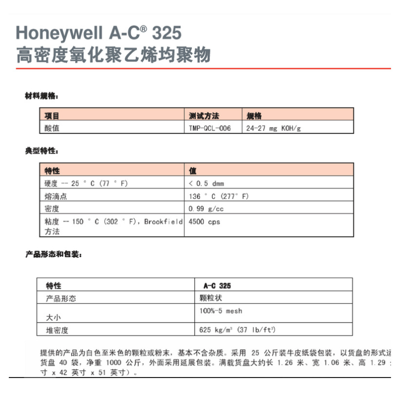 - Honeywell霍尼韋爾氧化聚乙烯蠟 A-C 325 蠟粉 酸值高易乳化 物性表, Honeywell霍尼韋爾氧化聚乙烯蠟 A-C 325 蠟粉 酸值高易乳化 產(chǎn)品參數(shù),Honeywell霍尼韋爾氧化聚乙烯蠟 A-C 325 蠟粉 酸值高易乳化 性能表,Honeywell霍尼韋爾氧化聚乙烯蠟 A-C 325 蠟粉 酸值高易乳化 出廠報告, MSDS,, 物質(zhì)安全資料表, UL黃卡,{ SGS報告, RoHS, 食品級認證, NSF飲用水標準, 產(chǎn)品資料, 產(chǎn)品性能, 出廠報告, 原廠原包, 代理商, 熱變形溫度, 熔指數(shù), 流動系數(shù), 抗沖擊性能、沖擊強度, 低溫韌性、低溫抗沖擊性能, 熔體流動系數(shù)、熔體流動速率, 加工工藝、加工參數(shù)、加工溫度, 歐盟RoHS 德國FDA 美國FDA 日本FDA