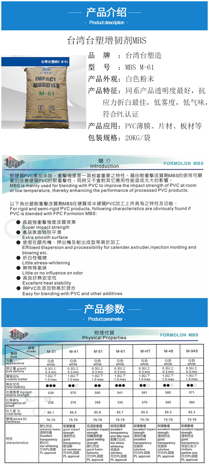 - 臺塑MBS M61高透明性 MBS61 抗折白 PVC簿膜片材板材增韌劑M-61 物性表, 臺塑MBS M61高透明性 MBS61 抗折白 PVC簿膜片材板材增韌劑M-61 產(chǎn)品參數(shù),臺塑MBS M61高透明性 MBS61 抗折白 PVC簿膜片材板材增韌劑M-61 性能表,臺塑MBS M61高透明性 MBS61 抗折白 PVC簿膜片材板材增韌劑M-61 出廠報告, MSDS,, 物質(zhì)安全資料表, UL黃卡,{ SGS報告, RoHS, 食品級認證, NSF飲用水標準, 產(chǎn)品資料, 產(chǎn)品性能, 出廠報告, 原廠原包, 代理商, 熱變形溫度, 熔指數(shù), 流動系數(shù), 抗沖擊性能、沖擊強度, 低溫韌性、低溫抗沖擊性能, 熔體流動系數(shù)、熔體流動速率, 加工工藝、加工參數(shù)、加工溫度, 歐盟RoHS 德國FDA 美國FDA 日本FDA
