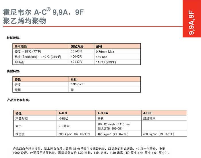 - 霍尼韋爾 A-C® 9A 低密度聚乙烯 (LDPE) 均聚物 物性表, 霍尼韋爾 A-C® 9A 低密度聚乙烯 (LDPE) 均聚物 產(chǎn)品參數(shù),霍尼韋爾 A-C® 9A 低密度聚乙烯 (LDPE) 均聚物 性能表,霍尼韋爾 A-C® 9A 低密度聚乙烯 (LDPE) 均聚物 出廠報告, MSDS,, 物質(zhì)安全資料表, UL黃卡,{ SGS報告, RoHS, 食品級認證, NSF飲用水標準, 產(chǎn)品資料, 產(chǎn)品性能, 出廠報告, 原廠原包, 代理商, 熱變形溫度, 熔指數(shù), 流動系數(shù), 抗沖擊性能、沖擊強度, 低溫韌性、低溫抗沖擊性能, 熔體流動系數(shù)、熔體流動速率, 加工工藝、加工參數(shù)、加工溫度, 歐盟RoHS 德國FDA 美國FDA 日本FDA