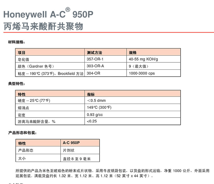 - 霍尼韋爾 honeywell 丙烯馬來酸酐共聚物 A-C 950P 適用熱熔膠電纜塑料改性 物性表, 霍尼韋爾 honeywell 丙烯馬來酸酐共聚物 A-C 950P 適用熱熔膠電纜塑料改性 產(chǎn)品參數(shù),霍尼韋爾 honeywell 丙烯馬來酸酐共聚物 A-C 950P 適用熱熔膠電纜塑料改性 性能表,霍尼韋爾 honeywell 丙烯馬來酸酐共聚物 A-C 950P 適用熱熔膠電纜塑料改性 出廠報告, MSDS,, 物質(zhì)安全資料表, UL黃卡,{ SGS報告, RoHS, 食品級認證, NSF飲用水標準, 產(chǎn)品資料, 產(chǎn)品性能, 出廠報告, 原廠原包, 代理商, 熱變形溫度, 熔指數(shù), 流動系數(shù), 抗沖擊性能、沖擊強度, 低溫韌性、低溫抗沖擊性能, 熔體流動系數(shù)、熔體流動速率, 加工工藝、加工參數(shù)、加工溫度, 歐盟RoHS 德國FDA 美國FDA 日本FDA