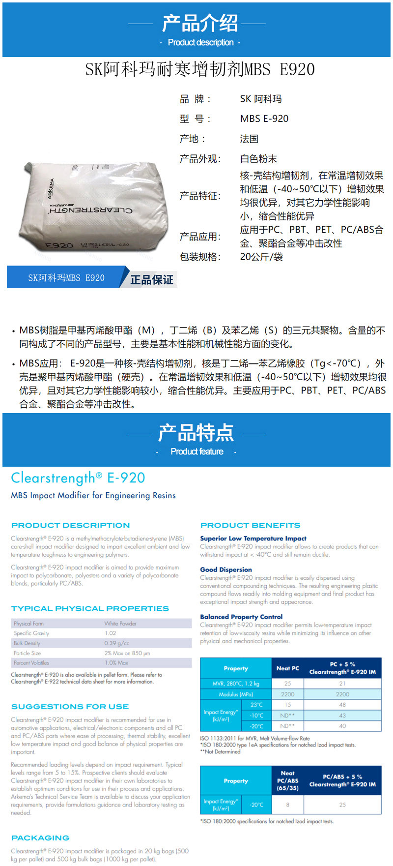 - 增韌劑MBS E920 抗沖擊改性劑 PC/ABS工程塑料增韌 SK阿科瑪E-920 物性表, 增韌劑MBS E920 抗沖擊改性劑 PC/ABS工程塑料增韌 SK阿科瑪E-920 產(chǎn)品參數(shù),增韌劑MBS E920 抗沖擊改性劑 PC/ABS工程塑料增韌 SK阿科瑪E-920 性能表,增韌劑MBS E920 抗沖擊改性劑 PC/ABS工程塑料增韌 SK阿科瑪E-920 出廠報告, MSDS,, 物質(zhì)安全資料表, UL黃卡,{ SGS報告, RoHS, 食品級認證, NSF飲用水標準, 產(chǎn)品資料, 產(chǎn)品性能, 出廠報告, 原廠原包, 代理商, 熱變形溫度, 熔指數(shù), 流動系數(shù), 抗沖擊性能、沖擊強度, 低溫韌性、低溫抗沖擊性能, 熔體流動系數(shù)、熔體流動速率, 加工工藝、加工參數(shù)、加工溫度, 歐盟RoHS 德國FDA 美國FDA 日本FDA