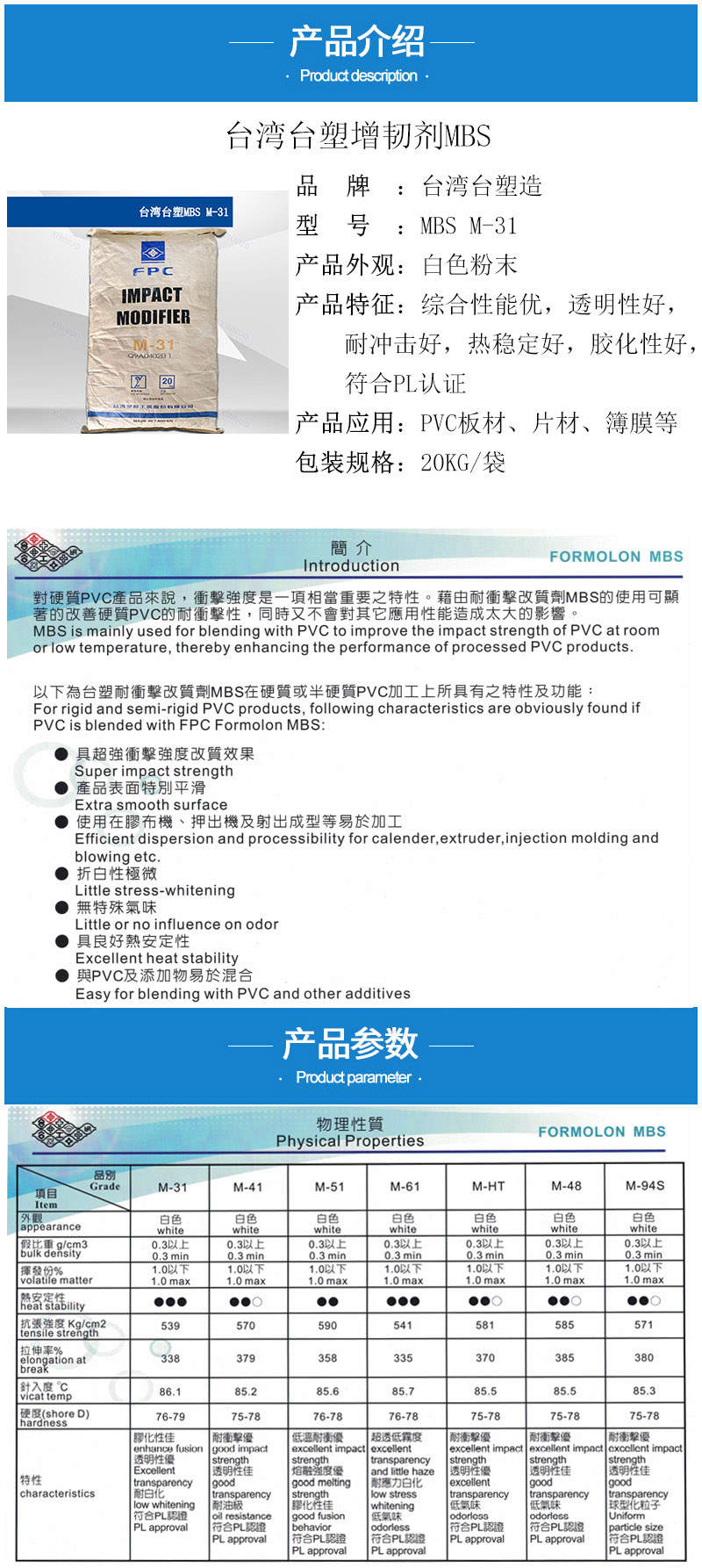 - 臺(tái)塑MBS M31綜合性能好 透明耐白化 PVC簿膜 板材片材 增韌劑M-31 物性表, 臺(tái)塑MBS M31綜合性能好 透明耐白化 PVC簿膜 板材片材 增韌劑M-31 產(chǎn)品參數(shù),臺(tái)塑MBS M31綜合性能好 透明耐白化 PVC簿膜 板材片材 增韌劑M-31 性能表,臺(tái)塑MBS M31綜合性能好 透明耐白化 PVC簿膜 板材片材 增韌劑M-31 出廠報(bào)告, MSDS,, 物質(zhì)安全資料表, UL黃卡,{ SGS報(bào)告, RoHS, 食品級認(rèn)證, NSF飲用水標(biāo)準(zhǔn), 產(chǎn)品資料, 產(chǎn)品性能, 出廠報(bào)告, 原廠原包, 代理商, 熱變形溫度, 熔指數(shù), 流動(dòng)系數(shù), 抗沖擊性能、沖擊強(qiáng)度, 低溫韌性、低溫抗沖擊性能, 熔體流動(dòng)系數(shù)、熔體流動(dòng)速率, 加工工藝、加工參數(shù)、加工溫度, 歐盟RoHS 德國FDA 美國FDA 日本FDA
