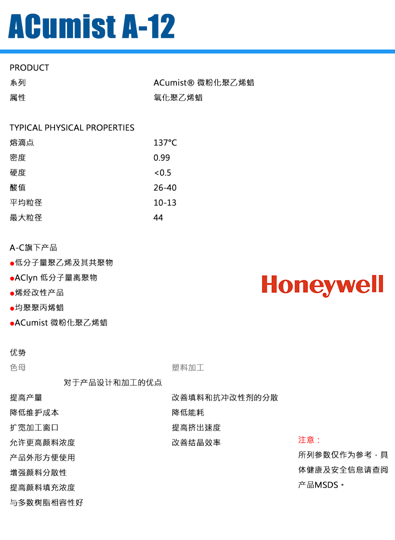 - 霍尼韋爾蠟粉 ACumist A-12 原裝進口 物性表, 霍尼韋爾蠟粉 ACumist A-12 原裝進口 產(chǎn)品參數(shù),霍尼韋爾蠟粉 ACumist A-12 原裝進口 性能表,霍尼韋爾蠟粉 ACumist A-12 原裝進口 出廠報告, MSDS,, 物質(zhì)安全資料表, UL黃卡,{ SGS報告, RoHS, 食品級認證, NSF飲用水標(biāo)準(zhǔn), 產(chǎn)品資料, 產(chǎn)品性能, 出廠報告, 原廠原包, 代理商, 熱變形溫度, 熔指數(shù), 流動系數(shù), 抗沖擊性能、沖擊強度, 低溫韌性、低溫抗沖擊性能, 熔體流動系數(shù)、熔體流動速率, 加工工藝、加工參數(shù)、加工溫度, 歐盟RoHS 德國FDA 美國FDA 日本FDA