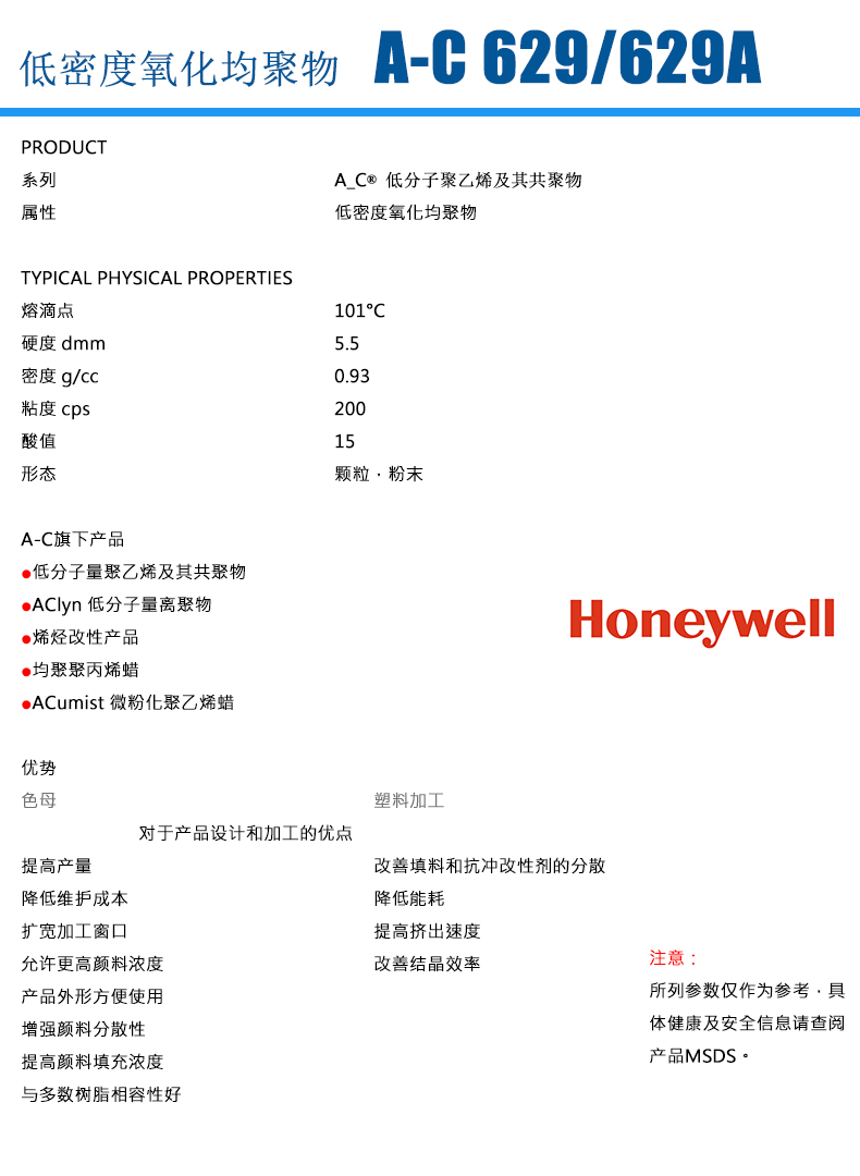 - Honeywell 霍尼韋爾氧化聚乙烯蠟A-C629A蠟粉 物性表, Honeywell 霍尼韋爾氧化聚乙烯蠟A-C629A蠟粉 產(chǎn)品參數(shù),Honeywell 霍尼韋爾氧化聚乙烯蠟A-C629A蠟粉 性能表,Honeywell 霍尼韋爾氧化聚乙烯蠟A-C629A蠟粉 出廠報(bào)告, MSDS,, 物質(zhì)安全資料表, UL黃卡,{ SGS報(bào)告, RoHS, 食品級(jí)認(rèn)證, NSF飲用水標(biāo)準(zhǔn), 產(chǎn)品資料, 產(chǎn)品性能, 出廠報(bào)告, 原廠原包, 代理商, 熱變形溫度, 熔指數(shù), 流動(dòng)系數(shù), 抗沖擊性能、沖擊強(qiáng)度, 低溫韌性、低溫抗沖擊性能, 熔體流動(dòng)系數(shù)、熔體流動(dòng)速率, 加工工藝、加工參數(shù)、加工溫度, 歐盟RoHS 德國(guó)FDA 美國(guó)FDA 日本FDA