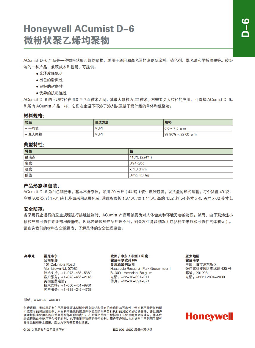 - 霍尼韋爾微粉蠟D6聚乙烯均聚物Honeywell ACumist D-6 物性表, 霍尼韋爾微粉蠟D6聚乙烯均聚物Honeywell ACumist D-6 產(chǎn)品參數(shù),霍尼韋爾微粉蠟D6聚乙烯均聚物Honeywell ACumist D-6 性能表,霍尼韋爾微粉蠟D6聚乙烯均聚物Honeywell ACumist D-6 出廠報(bào)告, MSDS,, 物質(zhì)安全資料表, UL黃卡,{ SGS報(bào)告, RoHS, 食品級(jí)認(rèn)證, NSF飲用水標(biāo)準(zhǔn), 產(chǎn)品資料, 產(chǎn)品性能, 出廠報(bào)告, 原廠原包, 代理商, 熱變形溫度, 熔指數(shù), 流動(dòng)系數(shù), 抗沖擊性能、沖擊強(qiáng)度, 低溫韌性、低溫抗沖擊性能, 熔體流動(dòng)系數(shù)、熔體流動(dòng)速率, 加工工藝、加工參數(shù)、加工溫度, 歐盟RoHS 德國(guó)FDA 美國(guó)FDA 日本FDA