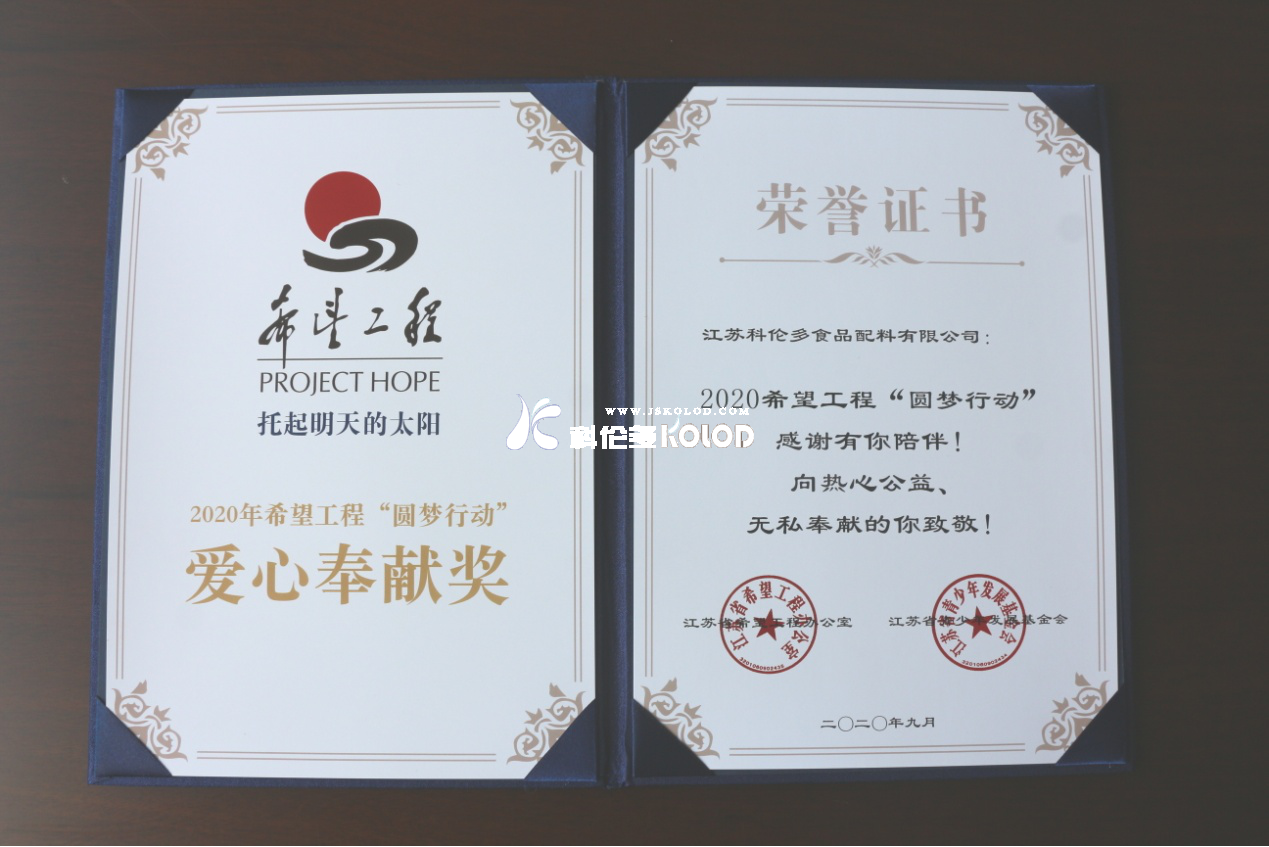 2020年9月24日,連云港市2020年希望工程“圓夢(mèng)行動(dòng)”如期進(jìn)行,江蘇科倫多食品配料有限公司捐贈(zèng)愛心資金十萬元,資助貧困大學(xué)生,同時(shí)公司被共青團(tuán)江蘇省委、江蘇省希望工程辦公室、江蘇省青少年發(fā)展基金會(huì)聯(lián)合表彰,授予2020年希望工程“圓夢(mèng)行動(dòng)”愛心奉獻(xiàn)獎(jiǎng),公司副董事長(zhǎng)翁京蓉代表公司上臺(tái)領(lǐng)獎(jiǎng)??苽惗喙居?0年的時(shí)間,詮釋了感恩社會(huì),傳遞愛心的宗旨,在奉獻(xiàn)愛心的征途中,科倫多還在繼續(xù)······