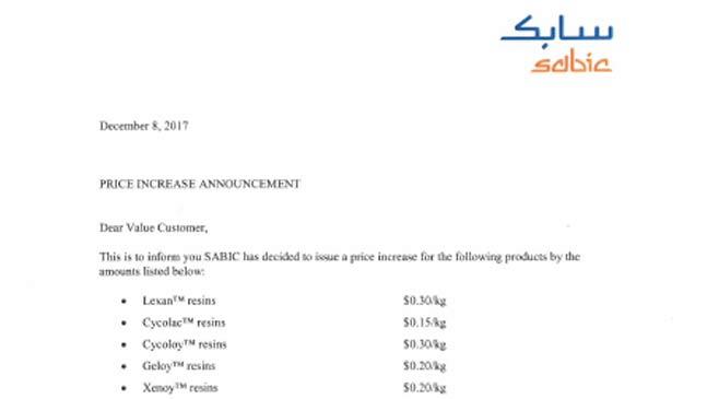鉅衍塑化小編通知大家, SABIC官方 漲價函如圖所示: 鉅衍塑化有限公司是一家銷售SABIC(即沙伯基礎(chǔ)創(chuàng)新塑料公司)工程塑...