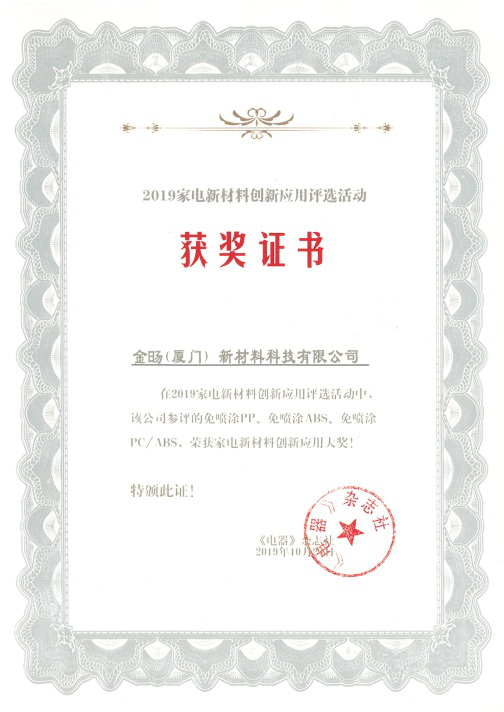 ????????改性塑料供應(yīng)商金旸新材料近日獲得由國(guó)內(nèi)家電行業(yè)權(quán)威媒體《電器》雜志社頒發(fā)的“家電新材料創(chuàng)新應(yīng)用大獎(jiǎng)”,該獎(jiǎng)旨在推廣材料創(chuàng)新的優(yōu)秀案例,讓中國(guó)家電企業(yè)通過(guò)對(duì)新材料的創(chuàng)新應(yīng)用盡快實(shí)現(xiàn)產(chǎn)品升級(jí)。金旸新材料開(kāi)發(fā)的免噴涂PP、免噴涂ABS、免噴涂PC/ABS三款環(huán)保材料在眾多參評(píng)產(chǎn)品中脫穎而出,經(jīng)過(guò)專(zhuān)家組評(píng)定,獲得家電新材料創(chuàng)新應(yīng)用大獎(jiǎng)。