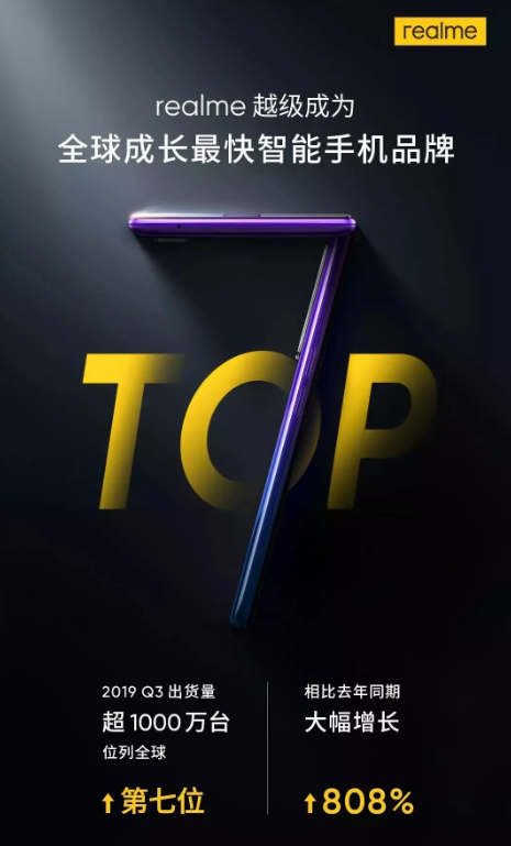 ????????據(jù)Counterpoint最新調(diào)研報(bào)告:realme手機(jī)第三季度出貨量超1000萬(wàn)臺(tái),同比增長(zhǎng)808%,位列全球前7,成為全球成長(zhǎng)最快的智能手機(jī)品牌。