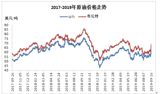 ????????9月14日,沙特關(guān)鍵原油設(shè)施遭受無人機攻擊,導(dǎo)致其關(guān)閉一半原油產(chǎn)量,影響全球約5%的日均產(chǎn)量。9月16日,原油受此提振大幅上漲,美布兩油均創(chuàng)下近十年內(nèi)最大漲幅,紐約商品期貨交易所WTI 10月原油期貨合約收盤上漲8.05美元,至62.90美元/桶,漲幅14.68%,洲際交易所布倫特11月原油期貨合約收盤上漲8.80美元,至69.02美元/桶,漲幅14.61%。