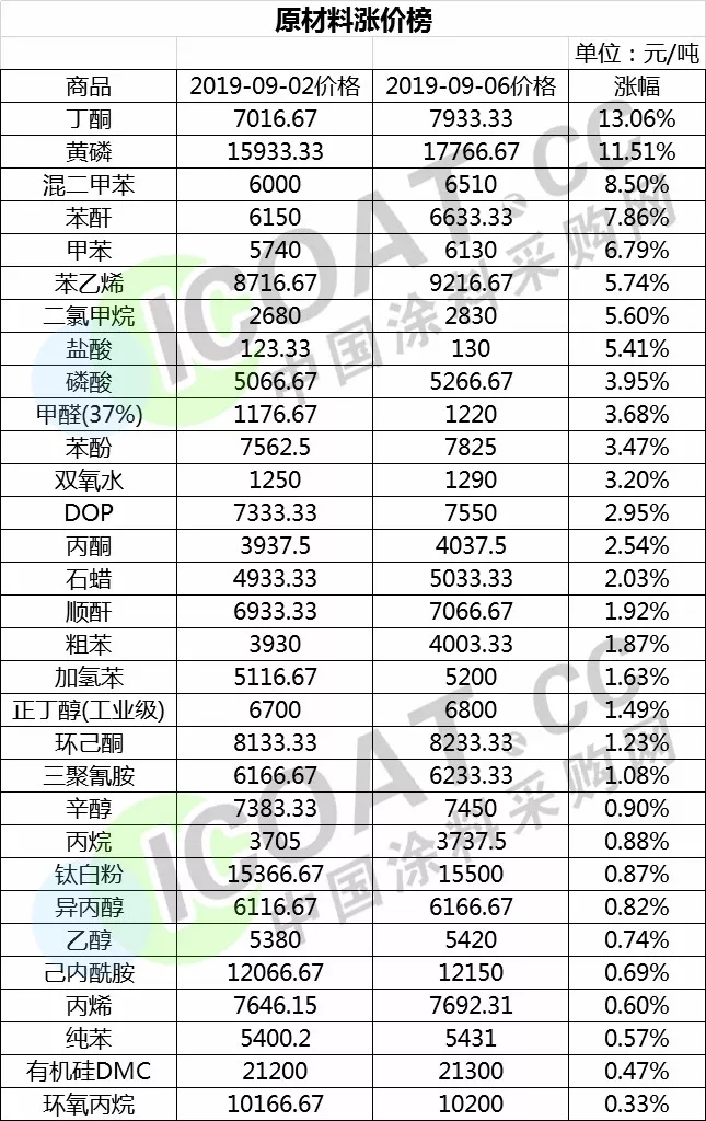 ????????在短短一周內(nèi),就有幾十種原材料價格呈現(xiàn)上漲趨勢,丁酮價格由7016.67元/噸漲至7933.33元/噸,漲幅為13.06%,位居漲價榜榜首。黃磷價格從15933.33元/噸漲至17766.67元/噸,漲幅為11.51%,混二甲苯價格由6000元/噸漲至6510元/噸,漲幅為8.50%,分別位居漲價榜第二名和第三名。