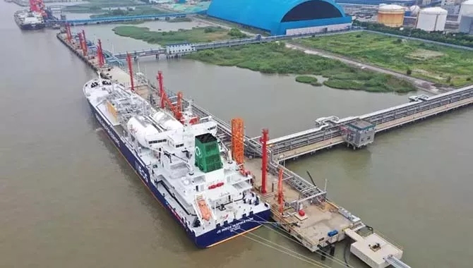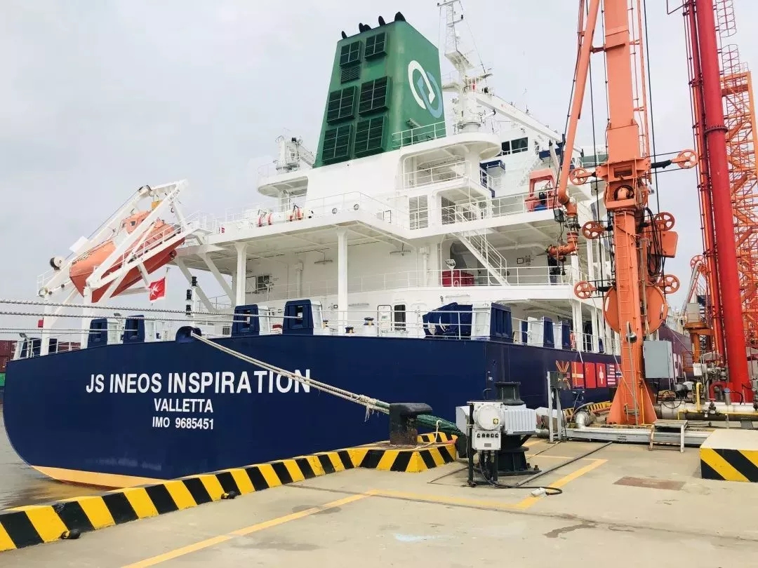 ????????8月7日13時,乙烷運輸船“英力士靈感號”靠泊泰興新浦2號碼頭。船上搭載的 1.5萬噸進口乙烷在經過南京海關所屬泰州海關的現(xiàn)場查驗后,順利開卸,這也是國內企業(yè)首次進口乙烷產品。