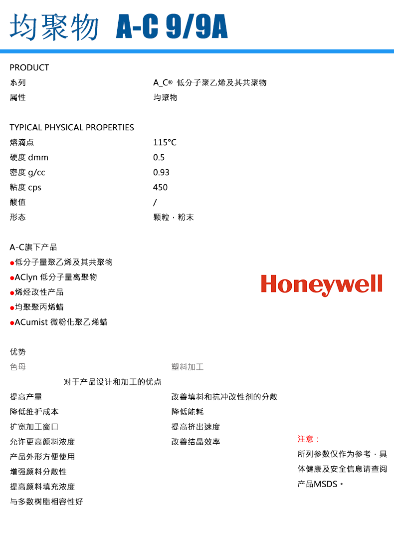 - 霍尼韋爾 A-C® 9A 低密度聚乙烯 (LDPE) 均聚物 物性表, 霍尼韋爾 A-C® 9A 低密度聚乙烯 (LDPE) 均聚物 產(chǎn)品參數(shù),霍尼韋爾 A-C® 9A 低密度聚乙烯 (LDPE) 均聚物 性能表,霍尼韋爾 A-C® 9A 低密度聚乙烯 (LDPE) 均聚物 出廠報告, MSDS,, 物質(zhì)安全資料表, UL黃卡,{ SGS報告, RoHS, 食品級認證, NSF飲用水標準, 產(chǎn)品資料, 產(chǎn)品性能, 出廠報告, 原廠原包, 代理商, 熱變形溫度, 熔指數(shù), 流動系數(shù), 抗沖擊性能、沖擊強度, 低溫韌性、低溫抗沖擊性能, 熔體流動系數(shù)、熔體流動速率, 加工工藝、加工參數(shù)、加工溫度, 歐盟RoHS 德國FDA 美國FDA 日本FDA