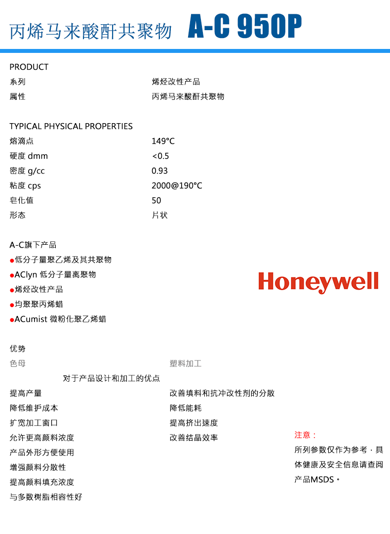 - 霍尼韋爾 honeywell 丙烯馬來酸酐共聚物 A-C 950P 適用熱熔膠電纜塑料改性 物性表, 霍尼韋爾 honeywell 丙烯馬來酸酐共聚物 A-C 950P 適用熱熔膠電纜塑料改性 產(chǎn)品參數(shù),霍尼韋爾 honeywell 丙烯馬來酸酐共聚物 A-C 950P 適用熱熔膠電纜塑料改性 性能表,霍尼韋爾 honeywell 丙烯馬來酸酐共聚物 A-C 950P 適用熱熔膠電纜塑料改性 出廠報告, MSDS,, 物質(zhì)安全資料表, UL黃卡,{ SGS報告, RoHS, 食品級認證, NSF飲用水標準, 產(chǎn)品資料, 產(chǎn)品性能, 出廠報告, 原廠原包, 代理商, 熱變形溫度, 熔指數(shù), 流動系數(shù), 抗沖擊性能、沖擊強度, 低溫韌性、低溫抗沖擊性能, 熔體流動系數(shù)、熔體流動速率, 加工工藝、加工參數(shù)、加工溫度, 歐盟RoHS 德國FDA 美國FDA 日本FDA