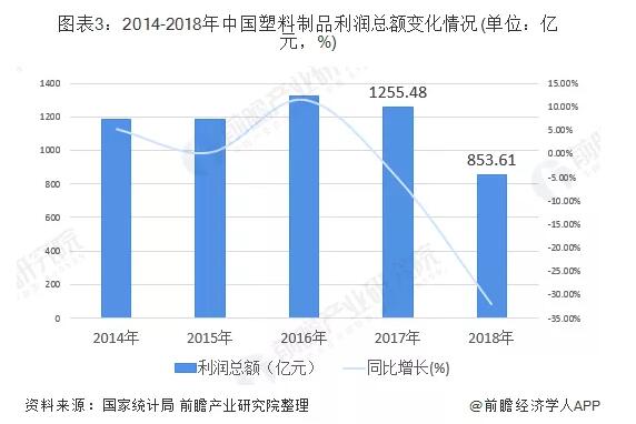 從行業(yè)利潤總額的情況來看,2014-2017年,中國塑料制品行業(yè)利潤總額呈波動上升的趨勢。2017年行業(yè)利潤總額達(dá)1255.48億元,2018年行業(yè)利潤總額驟跌至853.61億元,同比上年下降至32.01%。