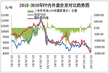 由2019年PP內(nèi)外盤價差對比發(fā)現(xiàn),12月份市場內(nèi)外盤價格開始逐步扭轉局勢,主因目前國際聚丙烯裝置多套開車并不順利,如馬來西亞石油公司裂解裝置問題及俄羅斯西布爾裝置前期開車均出現(xiàn)短期不順利現(xiàn)象,同時西方國家面臨新年節(jié)日,多數(shù)生產(chǎn)企業(yè)開工負荷下降,導致國內(nèi)到港資源偏緊。而國內(nèi)市場因產(chǎn)能急劇上升及終端訂單跟進乏力制約,國內(nèi)市場低價不斷頻現(xiàn),從而內(nèi)外盤價差逐步逆轉。