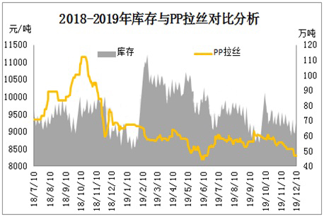 2019年12月庫存顯示整體呈現(xiàn)震蕩下滑趨勢,整體庫存維持在60-70萬噸/年,但全球經(jīng)濟偏弱運行及國內(nèi)實體企業(yè)訂單力度不及預期,市場原料消耗力度受到制約。同時2019年PP新一輪擴能高峰期再次來臨,浙江石化及大連恒力等大型聚烯烴裝置落地試運行,市場供需壓力更加凸顯,加快現(xiàn)貨市場拉絲下挫壓力。