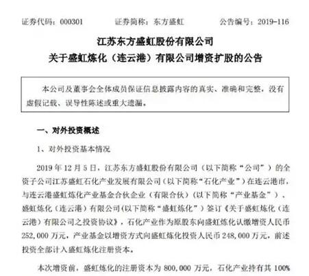 盛虹1600萬噸/年煉化項目增資50億,獲產(chǎn)業(yè)基金入股加持 12月5日,江蘇東方盛虹股份有限公司發(fā)布關(guān)于盛虹煉化(連云港)有限公司增資擴股的公告。公告稱,東方盛虹的全資子公司江蘇盛虹石化產(chǎn)業(yè)發(fā)展有限公司在連云港市,與連云港盛虹煉化產(chǎn)業(yè)基金合伙企業(yè)(有限合伙)、盛虹煉化(連云港)有限公司簽訂《關(guān)于盛虹煉化(連云港)有限公司之投資協(xié)議》,石化產(chǎn)業(yè)作為原股東向盛虹煉化認繳增資人民幣252,000萬元,產(chǎn)業(yè)基金以增資方式向盛虹煉化投資人民幣248,000萬元,前述投資全部計入盛虹煉化注冊資本。