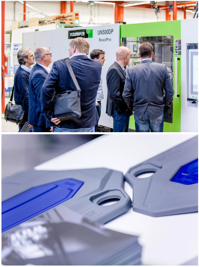 伊之密與合作伙伴Frimo提供的ReactPro方案,將注射成型與聚氨酯(PUR)包覆工藝結(jié)合在一起,更簡(jiǎn)單、更模塊化、更靈活、更具成本效益。在Frimo總部舉行的聯(lián)合技術(shù)開放日上,第一套高度集成和自動(dòng)化的ReactPro系統(tǒng)亮相,現(xiàn)場(chǎng)生產(chǎn)帶聚氨酯表面的發(fā)動(dòng)機(jī)蓋,吸引了不少感興趣的專業(yè)觀眾。