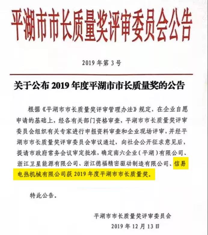 平湖市市長(zhǎng)質(zhì)量獎(jiǎng)是平湖市人民政府設(shè)立的最高質(zhì)量獎(jiǎng)項(xiàng),由平湖市政府表彰和獎(jiǎng)勵(lì),每年度評(píng)審一次,每屆不超過(guò)5個(gè)。該獎(jiǎng)項(xiàng)旨在發(fā)揮市長(zhǎng)質(zhì)量獎(jiǎng)的導(dǎo)向作用,推動(dòng)企業(yè)實(shí)施卓越績(jī)效模式和先進(jìn)質(zhì)量管理方法,深入開展質(zhì)量管理創(chuàng)新、質(zhì)量強(qiáng)企創(chuàng)建活動(dòng),樹立質(zhì)量標(biāo)桿,加強(qiáng)典型示范,加快推進(jìn)質(zhì)量強(qiáng)市建設(shè),促進(jìn)經(jīng)濟(jì)轉(zhuǎn)型升級(jí)。平湖信易2019年度獲此殊榮,深感榮幸,同時(shí)亦感到責(zé)任之深重,今后信易將繼續(xù)在精益管理,保證質(zhì)量,做好品牌等方面努力進(jìn)取,追求卓越,為塑膠輔機(jī)行業(yè)做出更大的貢獻(xiàn)。