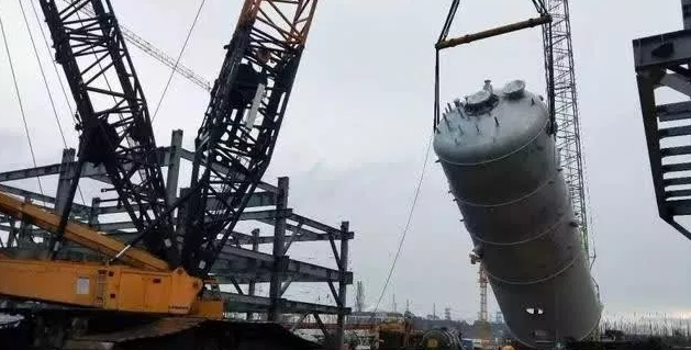12月21日,福建百宏石化年產(chǎn)250萬噸精對苯二甲酸PTA項目的第一臺大型設備“第三CTA結(jié)晶器”順利吊裝成功。本設備凈重121.4t,直徑6.5米,高18.2米,主吊選用利勃海爾750噸履帶吊,溜尾選用180噸履帶吊。