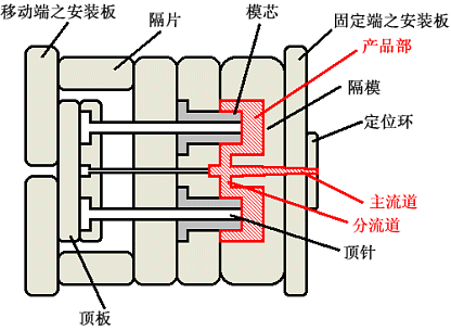 成型品是由熔融樹脂進入的主流道,引導(dǎo)熔融樹脂進入模腔的分流道及制品所構(gòu)成的。