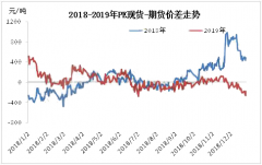2019年中國(guó)PE期現(xiàn)基差范圍較2018年縮窄,以華北煤化工7042價(jià)格與LL主力合約結(jié)算價(jià)基差來(lái)看,全年升貼水范圍...
