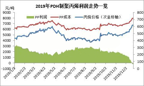 ????????從跟蹤的PDH產(chǎn)業(yè)利潤來看,丙烷脫氫制聚丙烯盈利情況持續(xù)較好,以華東產(chǎn)品為例,2018年理論盈利在2640元/噸,2019年1-11月份盈利在2184元,持續(xù)強于其他工藝盈利水平。然進入12月份,國內(nèi)液化石油氣價格受國際市場大漲及國內(nèi)進口資源價格大幅上行帶動,各個地區(qū)出現(xiàn)不同幅度調(diào)漲,丙烷價格大幅飆升,自11月初至12月底,丙烷國際價格漲幅高達150美元/噸,而反觀國內(nèi)聚丙烯價格,自11月初至12月底,卻出現(xiàn)了大幅下滑,一再創(chuàng)下年內(nèi)新低點。丙烷脫氫路線制聚丙烯在中國聚丙烯市場話語權(quán)方面仍顯薄弱,對此輪聚丙大跌僅能被動接受,導致丙烷-PDH-PP路線利潤急速下滑,至12月下旬,已進入虧損狀態(tài),考慮當前市場售價,丙烷脫氫制聚丙烯單噸虧損已達200元/噸,且隨著國際市場丙烷價格持續(xù)走高,虧損仍有加劇擔憂。