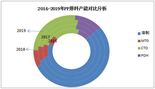 ????????由2016-2019年P(guān)P原料產(chǎn)能對(duì)比分析發(fā)現(xiàn),煤制烯烴產(chǎn)能增速最快,由2016年336萬(wàn)噸增加到2019年633萬(wàn)噸,增加297萬(wàn)噸。其中2016年煤制烯烴產(chǎn)能占比18%,2019年煤制烯烴產(chǎn)能占比已經(jīng)高達(dá)26%,占比增加8%,其增速令人驚訝。另外PDH系列也是增速較快產(chǎn)品,由于丙烷脫氫產(chǎn)品因成本優(yōu)勢(shì)明顯,后期擴(kuò)能產(chǎn)品也將呈現(xiàn)新得突破。原料多元化,市場(chǎng)競(jìng)爭(zhēng)壓力也將逐步升級(jí)。