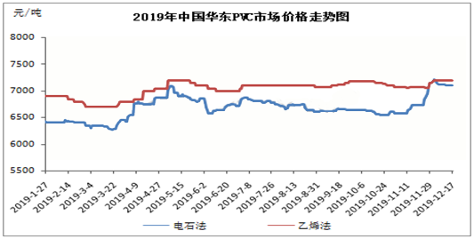 ????????2019年,PVC行情可謂是變化無常,全年呈現(xiàn)旺季不旺、淡季不淡的特點(diǎn)。與往年不同,全年價(jià)格最低點(diǎn)出現(xiàn)在3月份,而價(jià)格最高點(diǎn)出現(xiàn)在12月。截止12月中旬,PVC市場價(jià)格創(chuàng)新高后出現(xiàn)回落,各主銷地區(qū)市場價(jià)格陸續(xù)小幅松動,貿(mào)易商出貨多隨行就市為主,個(gè)別小幅讓利,下游依舊維持剛需,受利潤空間影響,接貨并不積極。PVC期貨偏弱震蕩以及市場貨源緊缺狀態(tài)有所緩解是目前價(jià)格出現(xiàn)松動的主要原因,但前期PVC生產(chǎn)廠家檢修后訂單良好,部分廠家貨源依舊不多仍然限制了PVC價(jià)格的回落空間。由上圖可以看出,12月上旬PVC華東市場價(jià)格雖出現(xiàn)松動,但空間十分有限。此外,PVC生產(chǎn)企業(yè)檢修已經(jīng)完成,預(yù)計(jì)后期供應(yīng)將有一定增加,市場貨源偏緊狀態(tài)將得到改善。
