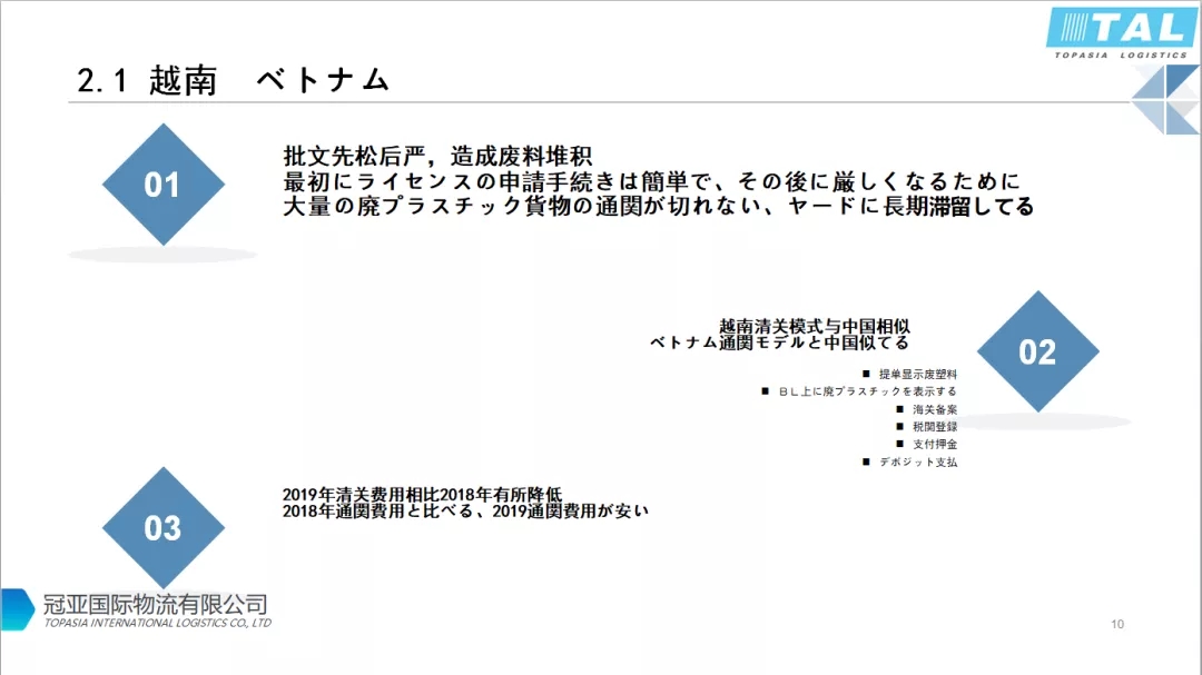 ????????有批文的還是可以正常清關(guān),通關(guān)時(shí)間也很迅速。越南廢料的清關(guān)模式跟之前中國(guó)很像,提單必須顯示廢塑料,收貨人需要在海關(guān)備案,進(jìn)口報(bào)關(guān)的時(shí)間需要支付押金?,F(xiàn)在問(wèn)題是只有少數(shù)幾家船公司愿意接去越南的貨。相比2018年的情況,2019年下半年陸續(xù)出來(lái)很多新的批文,清關(guān)費(fèi)用也在逐步降低。