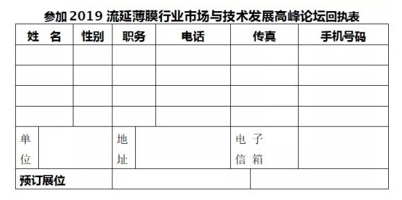 ????????1、請將上述回執(zhí)表于2019年12月20日前發(fā)郵件到[email protected]或發(fā)微信到13693270591(流延薄膜)。