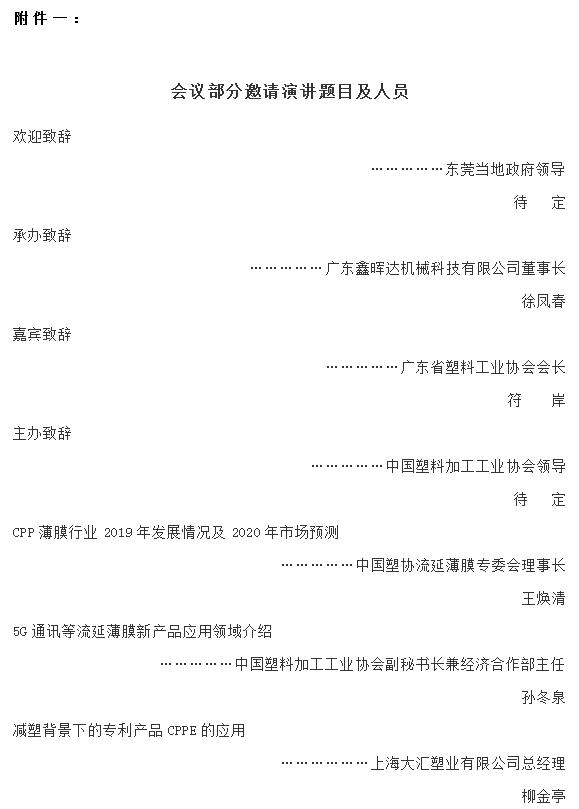 ????????2019年12月26日全天報到,26日下午14:00召開流延薄膜骨干企業(yè)負責(zé)人2019年度經(jīng)濟工作座談會暨流延薄膜專委會理事會擴大會議,27日開全體大會,12月27日下午四點參觀廣東鑫暉達機械科技有限公司。