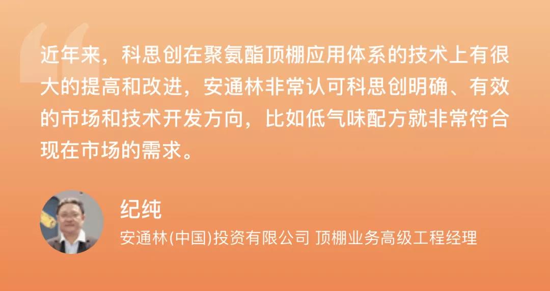 ????????在合作過程中,安通林以主動(dòng)開放的合作方式,為科思創(chuàng)提供有效的試制環(huán)境,并在研發(fā)過程中針對(duì)產(chǎn)品特性及時(shí)提出改進(jìn)建議,最終取得了可喜的成果??扑紕?chuàng)研發(fā)的聚氨酯頂棚解決方案采用了新型ISO生產(chǎn)工藝和新一代聚醚體系,可減少預(yù)攪拌流程。該材料穩(wěn)定性高,避免了頂棚不同區(qū)域吸音性能波動(dòng)大的問題。同時(shí),針對(duì)不同車型的技術(shù)要求變化,科思創(chuàng)可提供較寬的技術(shù)指標(biāo)范圍,能夠以一組體系滿足傳統(tǒng)兩組體系才能達(dá)到的效果。此外,使用該解決方案,VOC排放較行業(yè)主流水平可降低至多30-40%,有效提升了一個(gè)級(jí)別。