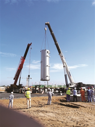 ????????11月2日,中國化學(xué)工程第六建設(shè)有限公司承建的海南華盛26萬噸/年非光氣法聚碳酸酯(PC)項(xiàng)目3臺導(dǎo)熱油爐主體吊裝一次性就位。
