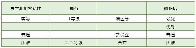 ????????在該修正案中, 將9種包裝材質(zhì)再生利用等級(jí)從1~3等級(jí)改進(jìn)為最優(yōu),優(yōu)秀,普通,差4個(gè)級(jí)別,將原來(lái)的1等級(jí)分解成最優(yōu)和優(yōu)秀,2~3等級(jí)合并成差,增加了普通等級(jí)。