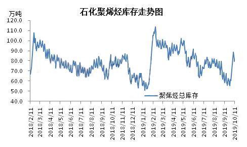 ????????為準(zhǔn)備國(guó)慶長(zhǎng)假,節(jié)前下游一度出現(xiàn)補(bǔ)倉(cāng),帶動(dòng)9月底庫(kù)存降至最低時(shí)為55.5萬(wàn)噸,雖最后庫(kù)存稍有增加,但整體情況尚可。隨著國(guó)慶長(zhǎng)假到來(lái),市場(chǎng)基本處于休市狀態(tài),導(dǎo)致假期石化庫(kù)存大幅積累,增加28萬(wàn)噸。即便節(jié)后下游補(bǔ)貨,但高庫(kù)存導(dǎo)致心態(tài)謹(jǐn)慎,多為剛需采購(gòu),庫(kù)存消耗緩慢并不理想。截止10月11日,石化兩桶油庫(kù)存為79.5萬(wàn)噸。