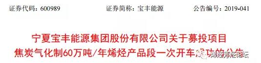 ????????公告顯示,焦炭氣化制60萬噸/年烯烴項(xiàng)目是寶豐能源首發(fā)上市募集資金投資項(xiàng)目,項(xiàng)目總投資金額達(dá)152.79億元。該項(xiàng)目主要分為兩段:前段焦炭氣化制220萬噸/年甲醇項(xiàng)目,后段甲醇制60萬噸/年聚烯烴項(xiàng)目,以及相關(guān)配套公用工程,預(yù)計(jì)將于2019年底前全部建成投產(chǎn)。
