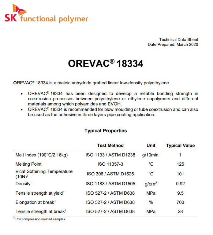 - LLDPE馬來酸酐改性 Orevac 18334 法國阿科瑪 EVOH極性樹脂粘接 物性表, LLDPE馬來酸酐改性 Orevac 18334 法國阿科瑪 EVOH極性樹脂粘接 產(chǎn)品參數(shù), LLDPE馬來酸酐改性 Orevac 18334 法國阿科瑪 EVOH極性樹脂粘接 性能表, LLDPE馬來酸酐改性 Orevac 18334 法國阿科瑪 EVOH極性樹脂粘接 出廠報告, MSDS,, 物質(zhì)安全資料表, UL黃卡,{ SGS報告, RoHS, 食品級認證, NSF飲用水標準, 產(chǎn)品資料, 產(chǎn)品性能, 出廠報告, 原廠原包, 代理商, 熱變形溫度, 熔指數(shù), 流動系數(shù), 抗沖擊性能、沖擊強度, 低溫韌性、低溫抗沖擊性能, 熔體流動系數(shù)、熔體流動速率, 加工工藝、加工參數(shù)、加工溫度, 歐盟RoHS 德國FDA 美國FDA 日本FDA