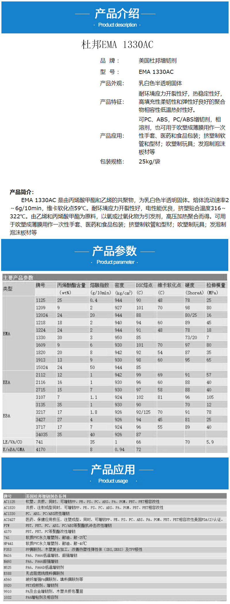 - EMA 杜邦 1330AC 相溶劑 增韌劑 注塑級 乙烯丙烯酸甲酯 美國 物性表, EMA 杜邦 1330AC 相溶劑 增韌劑 注塑級 乙烯丙烯酸甲酯 美國 產(chǎn)品參數(shù),EMA 杜邦 1330AC 相溶劑 增韌劑 注塑級 乙烯丙烯酸甲酯 美國 性能表,EMA 杜邦 1330AC 相溶劑 增韌劑 注塑級 乙烯丙烯酸甲酯 美國 出廠報告, MSDS,, 物質(zhì)安全資料表, UL黃卡,{ SGS報告, RoHS, 食品級認(rèn)證, NSF飲用水標(biāo)準(zhǔn), 產(chǎn)品資料, 產(chǎn)品性能, 出廠報告, 原廠原包, 代理商, 熱變形溫度, 熔指數(shù), 流動系數(shù), 抗沖擊性能、沖擊強度, 低溫韌性、低溫抗沖擊性能, 熔體流動系數(shù)、熔體流動速率, 加工工藝、加工參數(shù)、加工溫度, 歐盟RoHS 德國FDA 美國FDA 日本FDA
