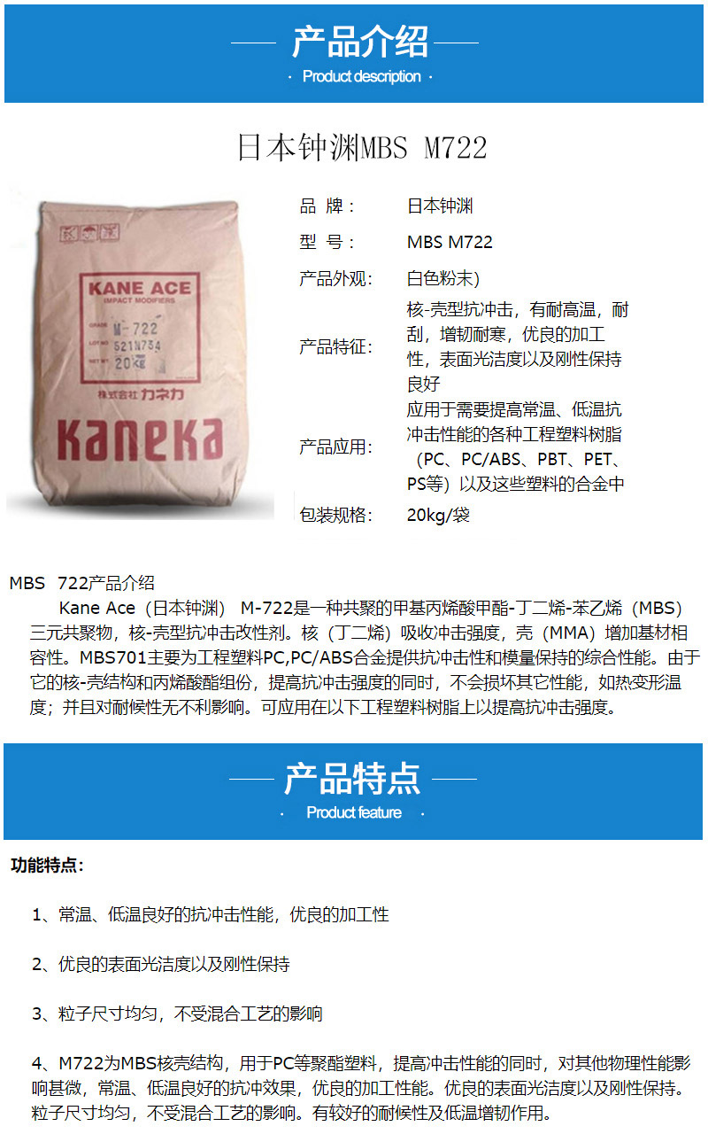 - MBS 722 PC增韌劑日本鐘淵 M-722粉末 PC/ABS抗沖擊改性劑 mbs722 物性表, MBS 722 PC增韌劑日本鐘淵 M-722粉末 PC/ABS抗沖擊改性劑 mbs722 產(chǎn)品參數(shù),MBS 722 PC增韌劑日本鐘淵 M-722粉末 PC/ABS抗沖擊改性劑 mbs722 性能表,MBS 722 PC增韌劑日本鐘淵 M-722粉末 PC/ABS抗沖擊改性劑 mbs722 出廠報告, MSDS,, 物質(zhì)安全資料表, UL黃卡,{ SGS報告, RoHS, 食品級認(rèn)證, NSF飲用水標(biāo)準(zhǔn), 產(chǎn)品資料, 產(chǎn)品性能, 出廠報告, 原廠原包, 代理商, 熱變形溫度, 熔指數(shù), 流動系數(shù), 抗沖擊性能、沖擊強(qiáng)度, 低溫韌性、低溫抗沖擊性能, 熔體流動系數(shù)、熔體流動速率, 加工工藝、加工參數(shù)、加工溫度, 歐盟RoHS 德國FDA 美國FDA 日本FDA