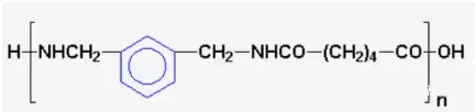 ????????尼龍-mxd6是由三菱氣體化學(xué)公司從m-xylenediamine(mxda)生產(chǎn)的廣泛的聚酰胺的通用名稱(chēng)。它是由間苯二甲胺mxda與己二酸的縮聚而產(chǎn)生的結(jié)晶聚酰胺。與尼龍6和尼龍66不同,尼龍mxd6是一種脂肪族聚酰胺,其主鏈中含有一個(gè)芳環(huán)?;瘜W(xué)結(jié)構(gòu)如下: