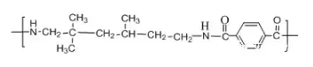 ????????英文名:polytrimethyl hexamethylene terephthalamide;transparent polyamide resin;透明尼龍是無(wú)定形聚酰胺,化學(xué)名稱(chēng)為:聚對(duì)苯二甲酰三甲基己二胺。其分子結(jié)構(gòu)式為: